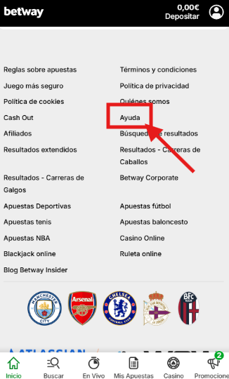 Nos preguntamos si Betway España tenía un centro de contacto o sección de preguntas frecuentes (FAQ), así que nos dirigimos al final de la página principal para dar con este apartado, al cual pudimos acceder luego de pulsar en el enlace de “Ayuda”.