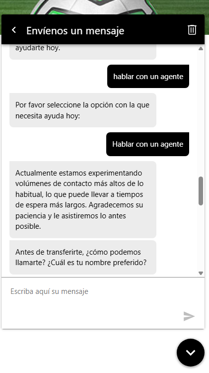 El chat en vivo de Betway está las 24 horas del día y funciona todos los días del año. La atención es en español y comienza con un asistente virtual por inteligencia artificial.